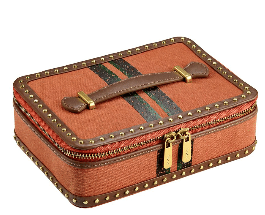 The Ida Travel Zip Case, features a canvas exterior made from recycled materials with stud detailing, leather trims and top handle. Inside, find multiple jewellery compartments with LusterLocâ„¢ lining.