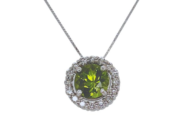 14 karat white gold necklace featuring a 2.30 carat round Peridot surrounded by 0.50 carats of diamonds